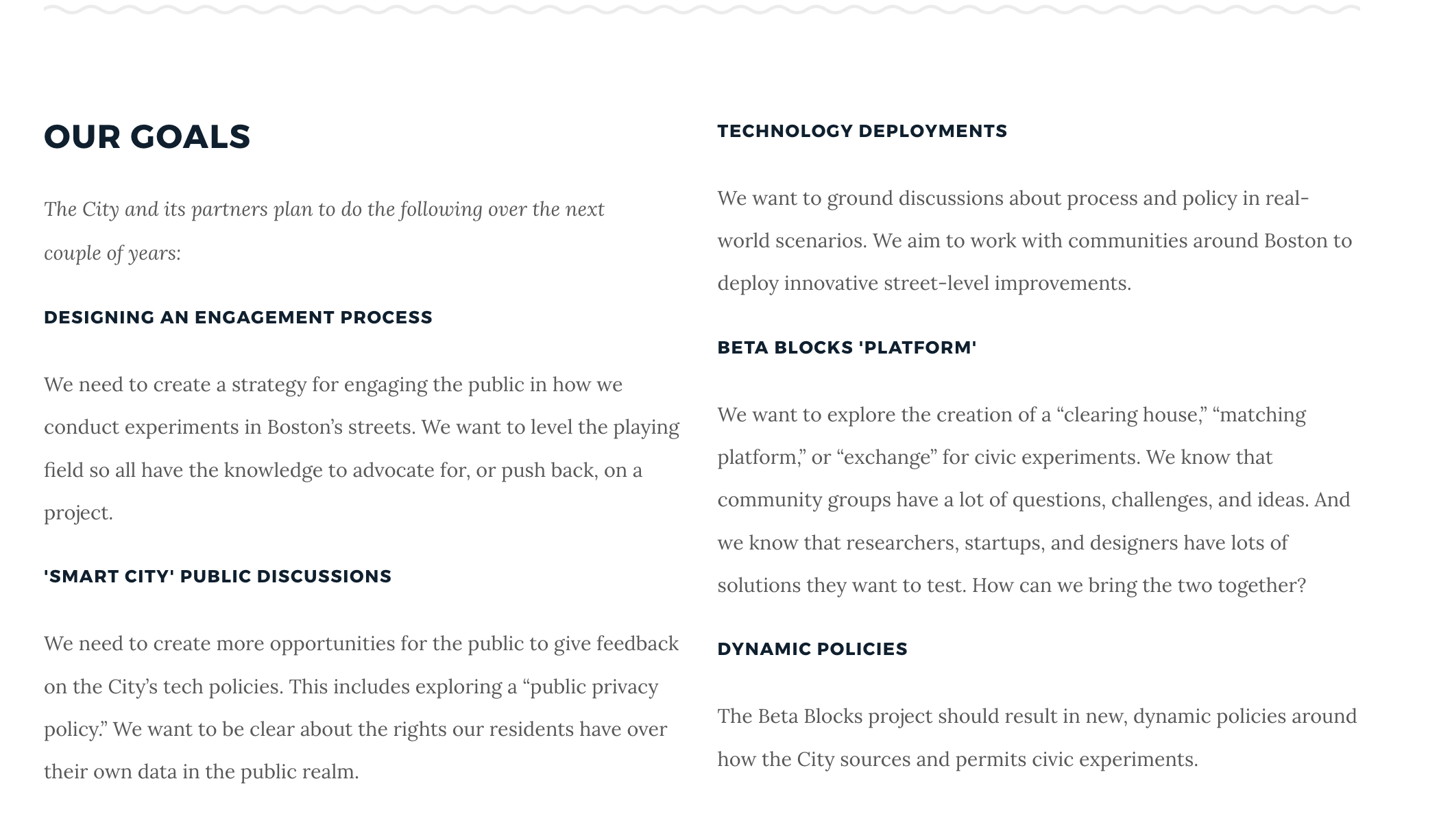 Beta Blocks is the name given to a series of projects, documents, and initiatives around developing a “smart city” policy for the City of Boston - in other words, a WTF should the City do with civic technology. Below are just some of the projects I led as part of this work.